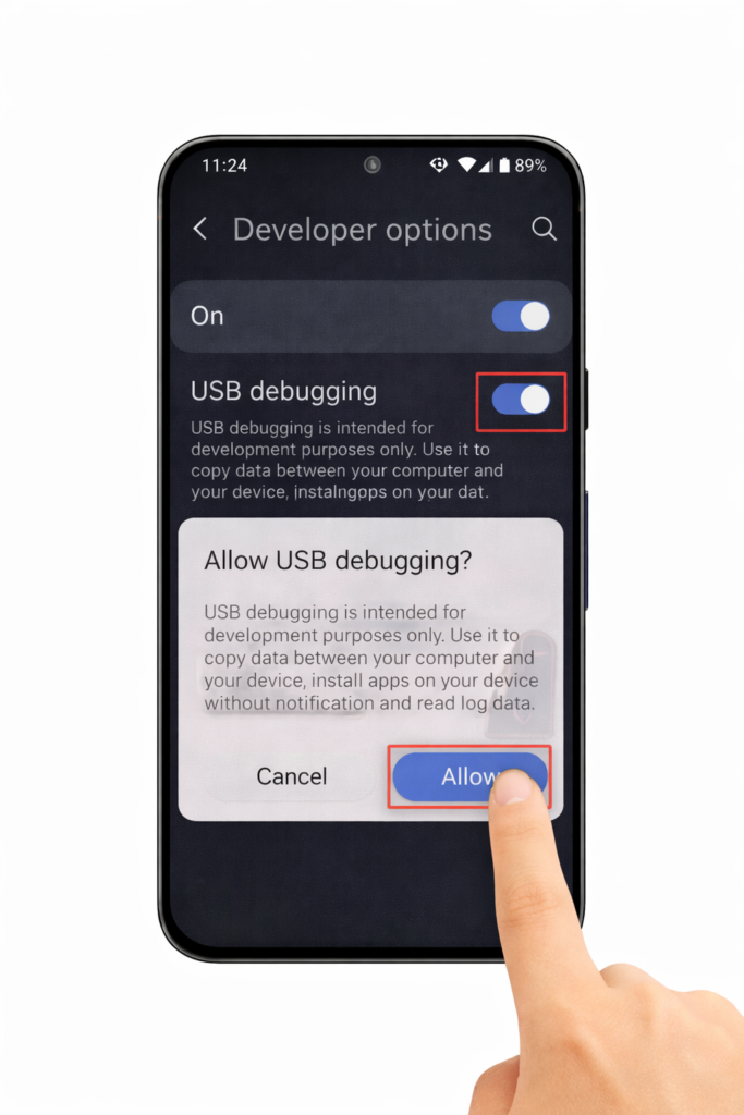 - On your phone, allow USB Debugging permission