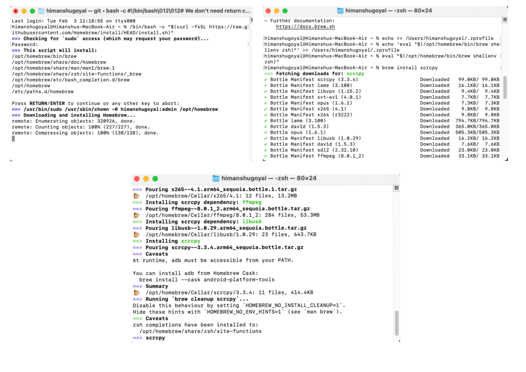 Installing Homebrew is the first step to mirror Android screen on Mac using scrcpy.Just copy the installation command from the official Homebrew website, paste it into your Terminal, and follow the instructions shown on the screen. Once it’s done, you’re ready to install scrcpy on your Mac.